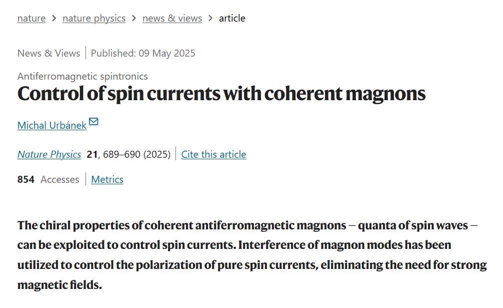 2. Urbánek, M. Control of spin currents with coherent magnons. Nat. Phys. 21, 689–690 (2025). http://doi.org/10.1038/s41567-025-02898-6
