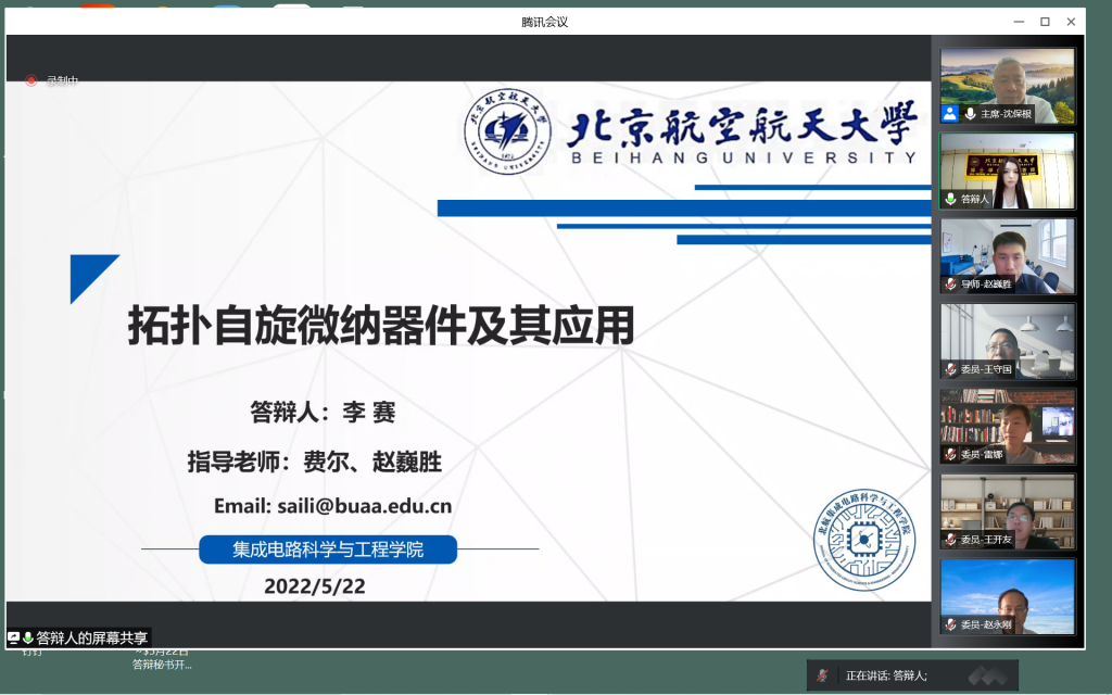 这场线上答辩的另一端是由五位专家组成的答辩委员会:中国科学院物理研究所沈保根院士,清华大学赵永刚教授,北京科技大学王守国教授,中国科学院半导体研究所王开友研究员以及北京麻豆精品秘 国产传媒雷娜副教授。答辩还吸引了学院相关领域100余名师生旁听。