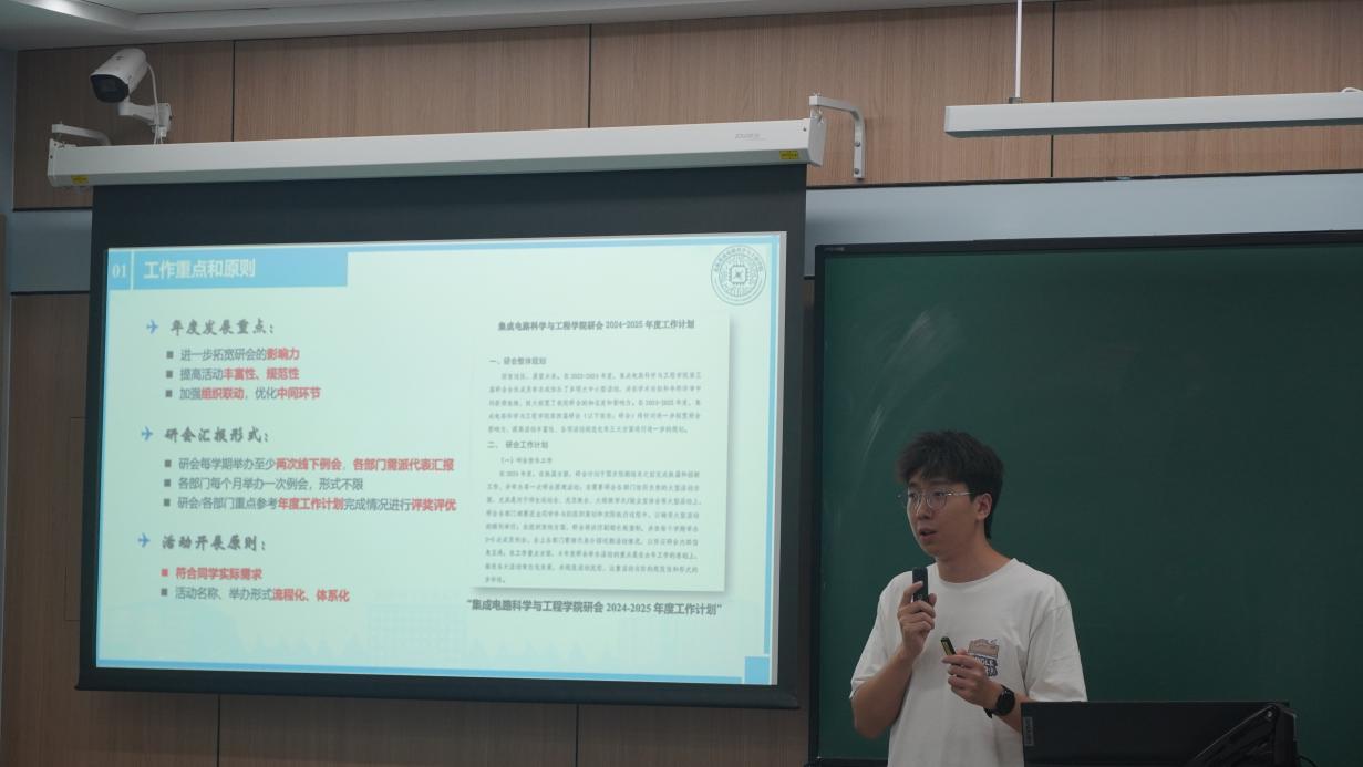 换届仪式后,研会执行主席程科勋向与会人员介绍新一学年的研会工作计划。展望2024-2025年度,研会将继续拓展影响力,提升活动的丰富性和规范化。就具体部门而言,就业部将统计年度就业数据、举办秋招经验分享沙龙及企业宣讲等;学术部将推出“芯火相传”系列活动,开展硕博论坛与学术交流,举办“芯中有术”系列讲座;而文体部则将组织趣味运动会、乒乓球、羽毛球比赛,以及元旦晚会等多项活动。