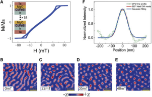 面对大规模应用,斯格明子的研究仍受困于可工业集成的全电学检测实现,而利用磁隧道结中隧穿磁阻变化来探测斯格明子有望解决这一问题[3]。因而,需要设计出可诱导斯格明子出现并且能应用于隧道结中的磁性薄膜结构。由于基于CoFeB/MgO结构的磁隧道结兼具垂直各向异性以及超高隧穿磁阻等优良特性[4,5],在这种异质结构中进行斯格明子相关的物理基础、材料参数依赖关系等研究具有重要意义[6]。