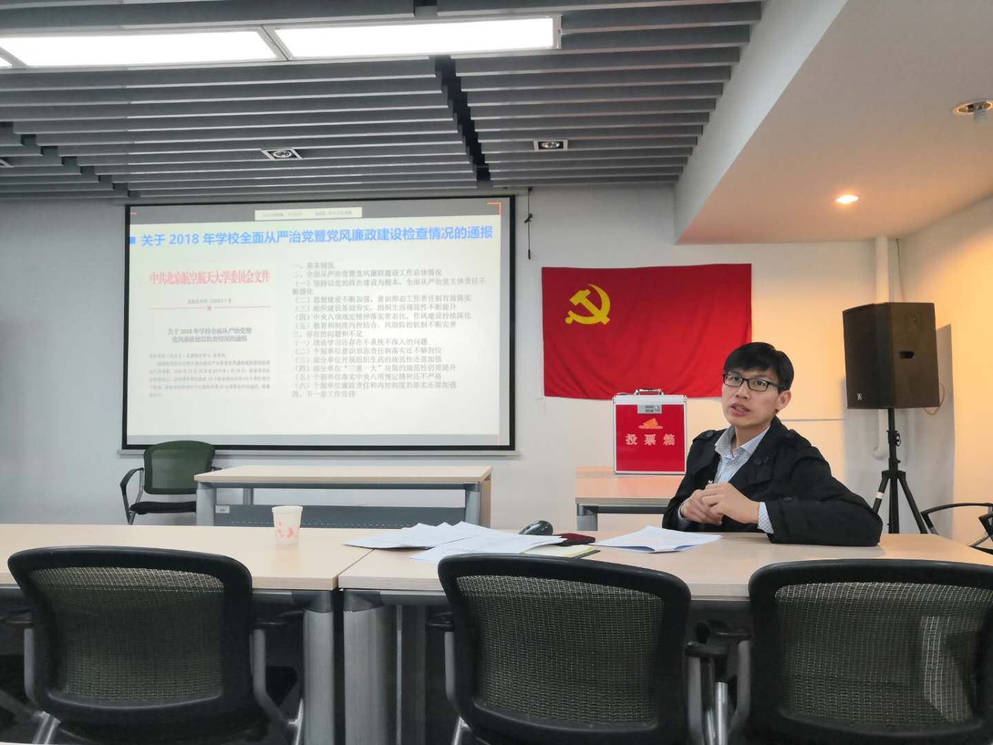 学院直属党支部书记梁恩和向全院师生传达了《北京麻豆精品秘 国产传媒教职工“学习日”活动指导意见》、组织全体师生学习了学校思想政治理论课教师座谈会精神、全国两会精神以及《党政领导干部选拔任用工作条例》、《党组工作条例》和《党员教育管理工作条例》等党内文件;宣贯了2019年学校全面从严治党工作会议暨警示教育大会精神以及学校近期重要文件,包括《2019年北京航空航天大学宣传思想文化工作要点》、《北京麻豆精品秘 国产传媒2019年纪检监察工作要点》、《北京麻豆精品秘 国产传媒2019年全面从严治党工作要点》。