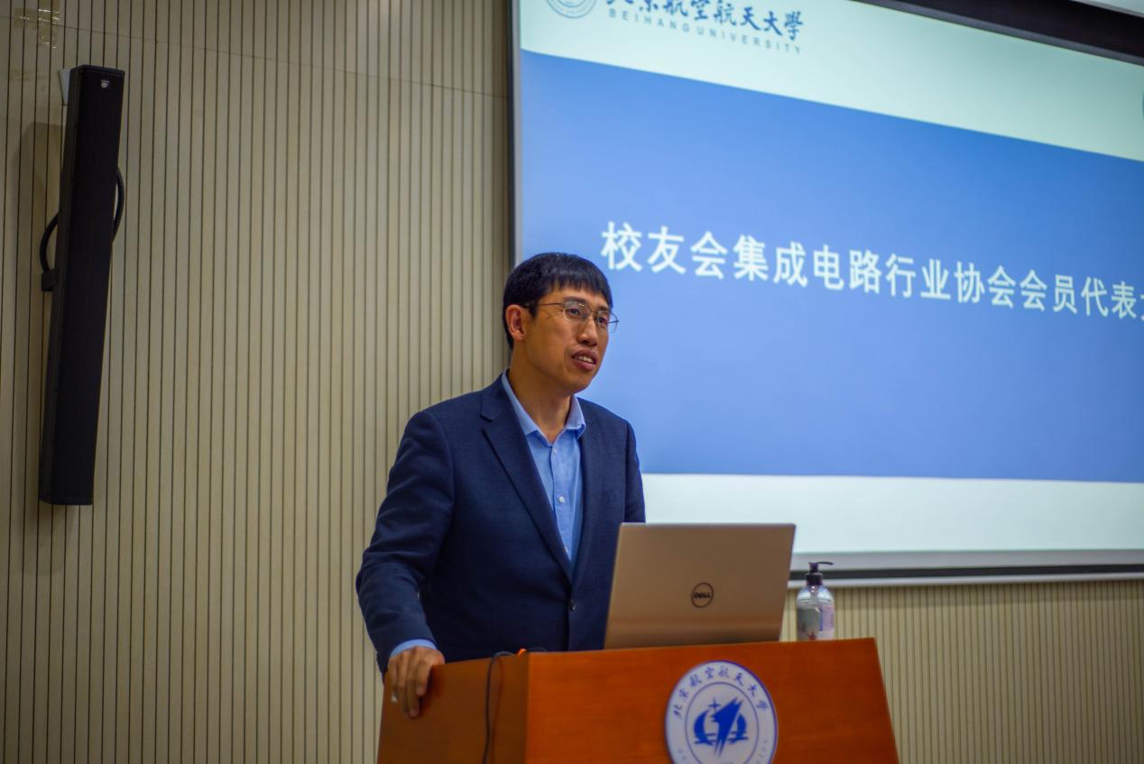 赵巍胜在致辞中对在座众多我国集成电路行业卓越人才的参会表达了诚挚的感谢。他指出,北航集成电路学院自成立以来就始终服务于国家重大战略需求、聚焦国家关键领域和方向,培养了一批批志在芯片报国的集成电路产业人才。北航校友们有着相同的文化根基,有着共同的家国情怀,他们活跃于集成电路产业上下游,紧密合作,一同为解决难题贡献力量。他还向参会人员介绍了北航集成学院微纳加工实验平台高速的建设情况,展现了学院蒸蒸日上的发展势头。无论是卓越工程师计划还是产教融合项目都体现了国家对于集成电路行业发展的重视,北航校友会集成电路行业协会以及北航集成电路学院师生也将不负国家终望,投身于集成电路行业,为我国集成电路行业的发展注入北航力量!