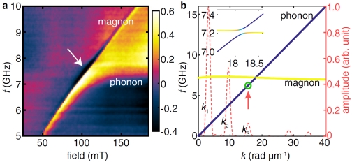 在这项工作中,北航团队实验研究了自旋波在BFO/LSMO异质结构(图1b)中的角度分辨传播自旋波谱(AR-PSWS)(图1c,d)和时间分辨布里渊光散射(TR-BLS,图4)。在角度分辨自旋波传播(AR-PSWS)光谱中观察到两种不同的自旋波模式(图1d):模式Y是LSMO中相干传播的自旋波模式,观测结果表明该模式以指数衰减,衰减长度约为5μm(图5)。模式X(图1d)并不常见,本研究团队将其确定为BFO/LSMO异质结构中的杂化磁振子-声子模式(或磁振子极化子),其以高达2.5km/s的群速度和高达1 mm的长衰变长度传播。TR-BLS观测到的结果表明它与BFO声子模式有关。数值模拟表明,通过BFO/LSMO界面的磁弹性耦合使BFO中的声子与LSMO中的磁振子杂交,形成磁振子极化子(图2),使得自旋波的衰减长度显著增长。