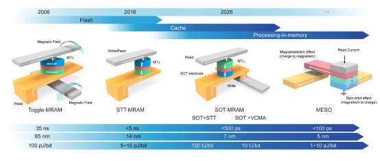 随着芯片产业的高速发展,集成电路特征尺寸的持续缩小,“功耗瓶颈与效率瓶颈”正成为限制集成电路技术发展的关键挑战。存算一体作为一种新型的计算架构,将数据存储与计算融和一体,能够大幅减少数据搬运距离,极大地降低了计算功耗与延时。近年来,非易失性存储器,特别是自旋磁存储器(MRAM)因为其高速、高能效、高密度的特点受到学术界和工业界的广泛关注,为后摩尔时代进一步提高计算能效带来曙光。赵巍胜教授团队总结了从1996年至今二十五年中自旋芯片技术的发展路径,以能耗及速度为牵引绘制了未来的技术发展路线图。在此基础上提出了基于全自旋电子器件的非易失计算存储架构,可大幅提高计算能效。