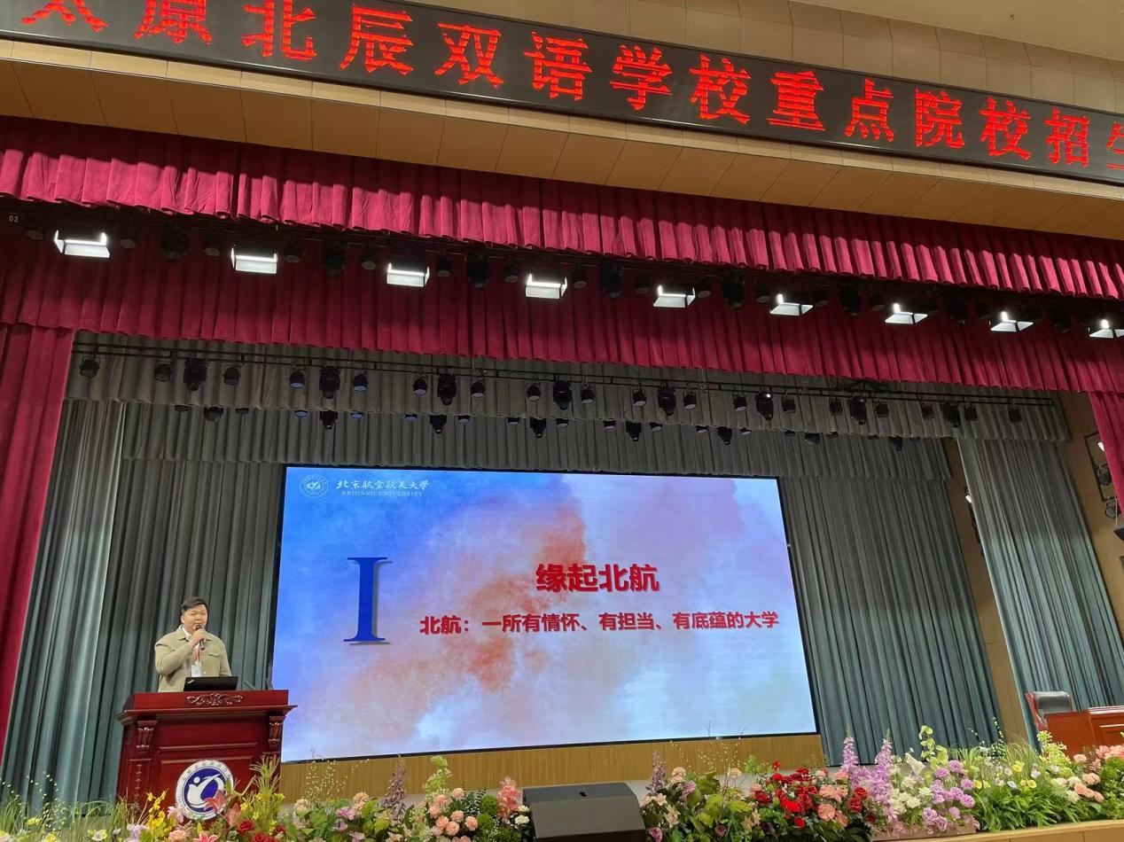 4月3日,山西招生组成员胡晏铭面向太原北辰双语学校、太原新希望双语学校的1000余名学生和家长开展招生宣讲,全方位讲述北航从诞生到蓬勃发展的光辉历程,剖析北航在学科建设、师资力量、科研创新等方面的突出优势,解读北航最新招生政策,帮助考生和家长了解招生规则与专业方向,使学生和家长对北航有更多的了解。