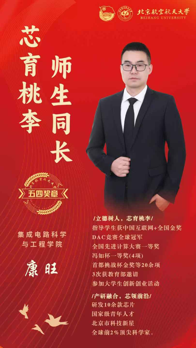 康旺老师已指导学生获中国国际大学生(原互联网+)创新创业大赛全国金奖、国际顶会DAC电子设计竞赛GPU赛道全球冠军、全国先进计算技术创新大赛总决赛一等奖、首都挑战杯金奖、全国挑战杯银奖,北京市/深圳市大学生创新创业大赛一等奖,冯如杯一等奖(4项,其中2项为全校冠军)等高水平科技竞赛奖项20余项;指导国家级大学生创新创业训练计划2项并优秀结题;指导北京市级/北航校级优秀本科/硕士毕业设计论文4项;3次受教育部邀请参加国家级大学生创新创业活动;本人也获得2024年集成电路学院院长教学奖。