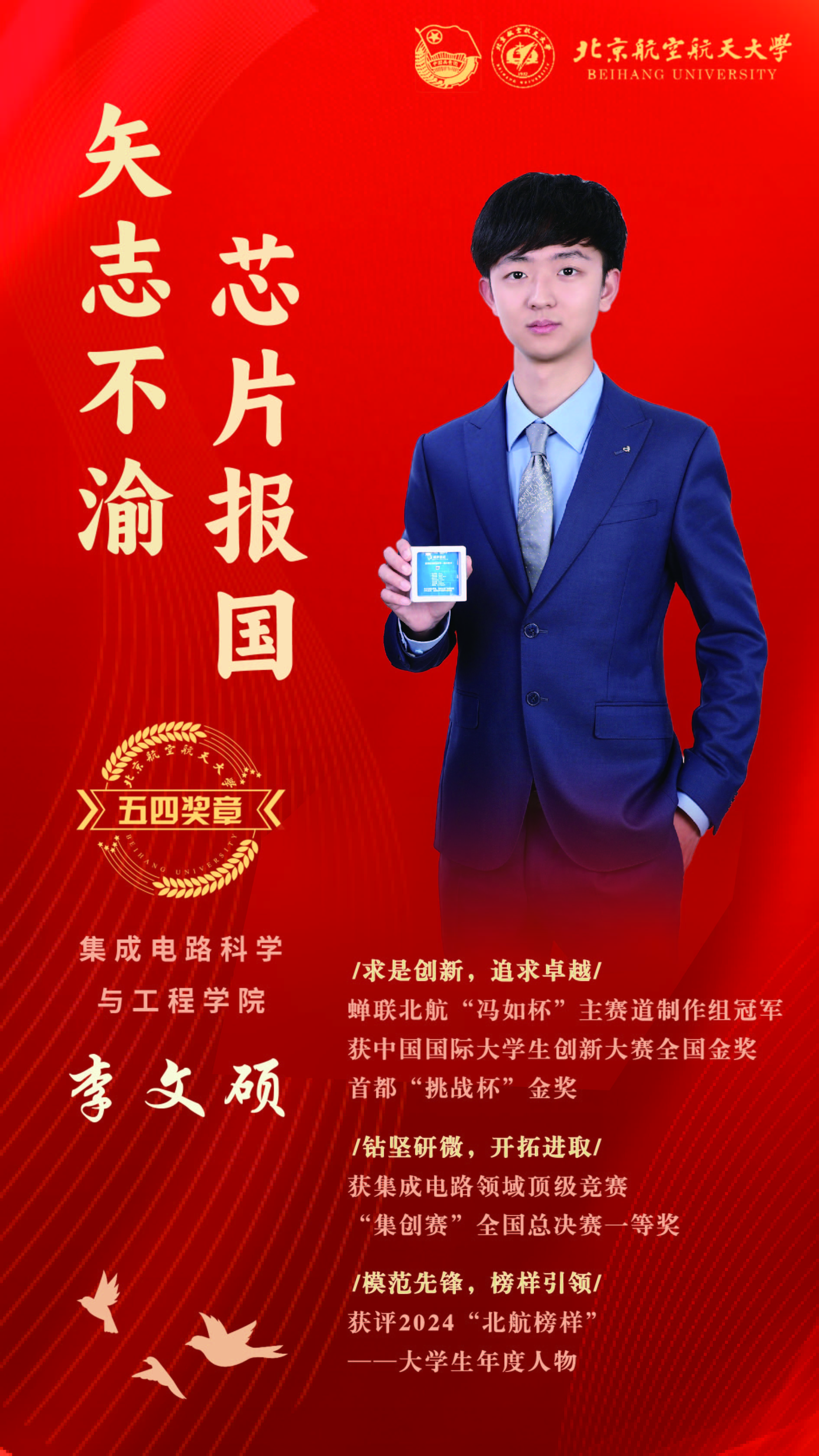 李文硕同学积极发挥榜样作用,引领模范,曾获评2024年度“北航榜样”——大学生年度人物。因创新创业成绩优异,他曾接受中国青年报一次现场采访,一次线上专访,作为新时代集成电路人才,向世界弘扬北航精神。