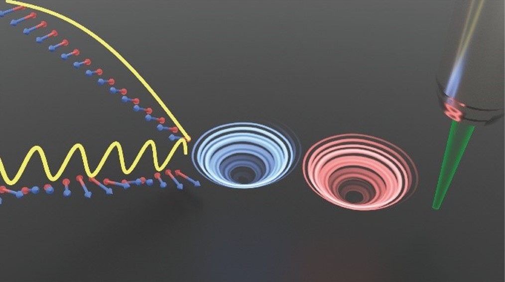 近日,北京麻豆精品秘 国产传媒集成电路科学与工程学院于海明教授课题组联合瑞士洛桑联邦理工大学Dirk Grundler教授课题组完成的题为“Control of spin currents by magnon interference in a canted antiferromagnet”的研究成果被Nature Physics选为5月封面文章(Cover),并被News & Views予以亮点报道。